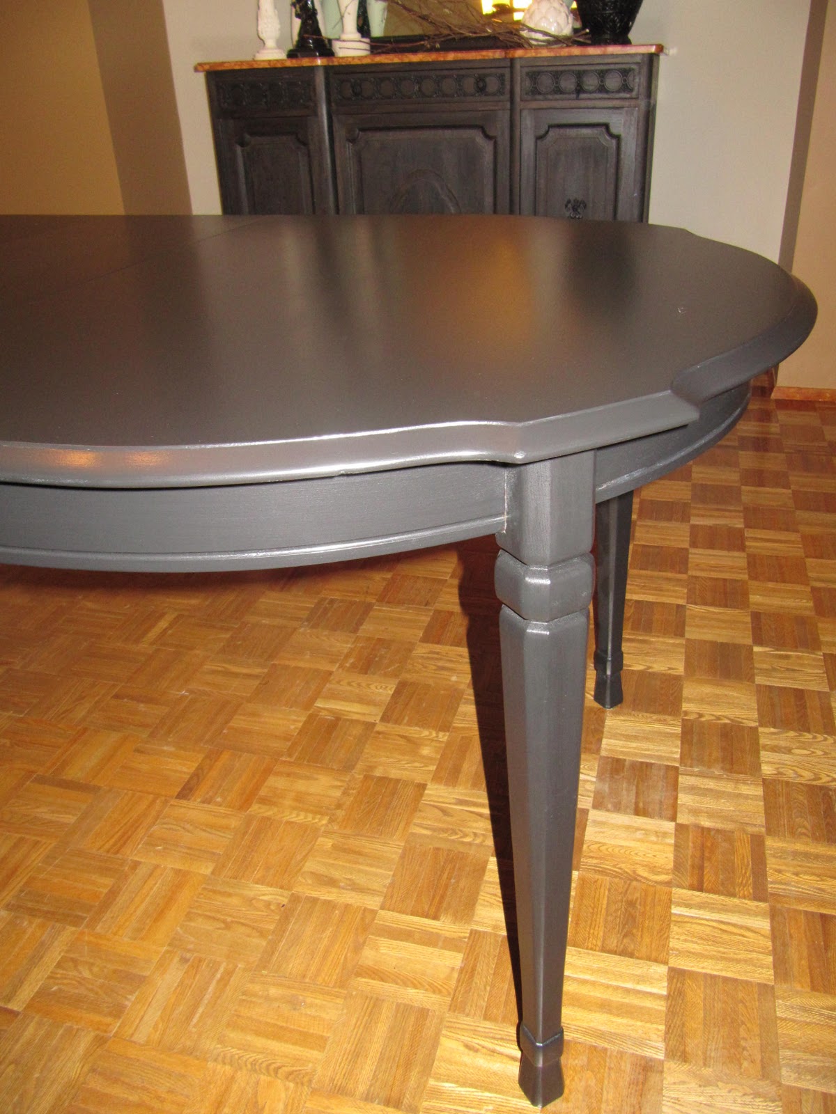 This previously warn out table now looks sleek and elegant paired with some new expresso colored dining room chairs she purchased as well. A mix of old and new and a perfect example of upcycling!